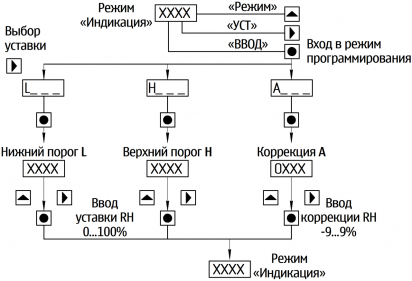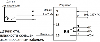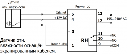 Регулятор получает от датчика сигнал о текущем значении влажности и сравнивает с пределами MAX и MIN, которые необходимо установить заранее в % отн.влажности. В случае превышения пределов, в регуляторе срабатывает реле, к контактам которого следует подключать внешние приборы: увлажнители, осушители, вентиляторы и другие микроклиматические устройства.